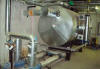 Heat energy / year W(w) = 4200 x 5500 kW h = 23.1 million kWhThe plant uses untreated wood to fuel a 5 MW high pressure boiler plant with flue gas cleaning filters. The generated high vapor pressure (28 bar nominal pressure) of the boiler system is used to supply a 820 kW steam turbine. The exhaust steam from the turbine is converted into hot water in the heating condenser.